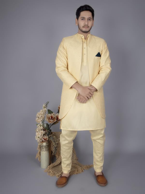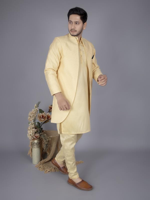 Designed with a Mandarin collar, full sleeves, and mid-thigh length, this outfit ensures a dignified and polished appearance for every special occasion. Whether it’s a festival, family ceremony, engagement, reception, or grand wedding function, this traditional ensemble guarantees style and comfort in every moment.