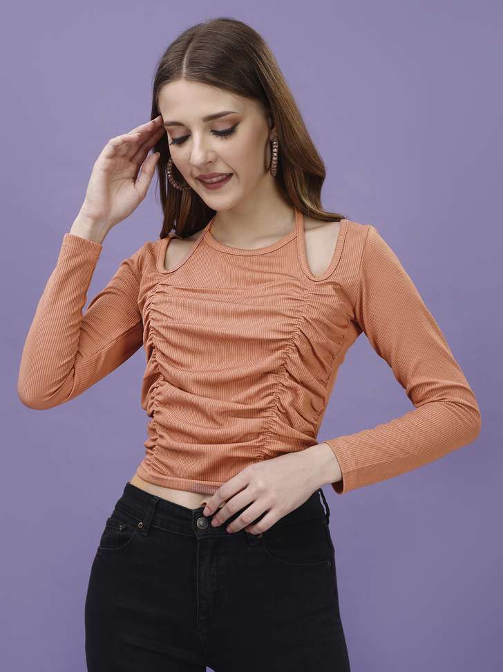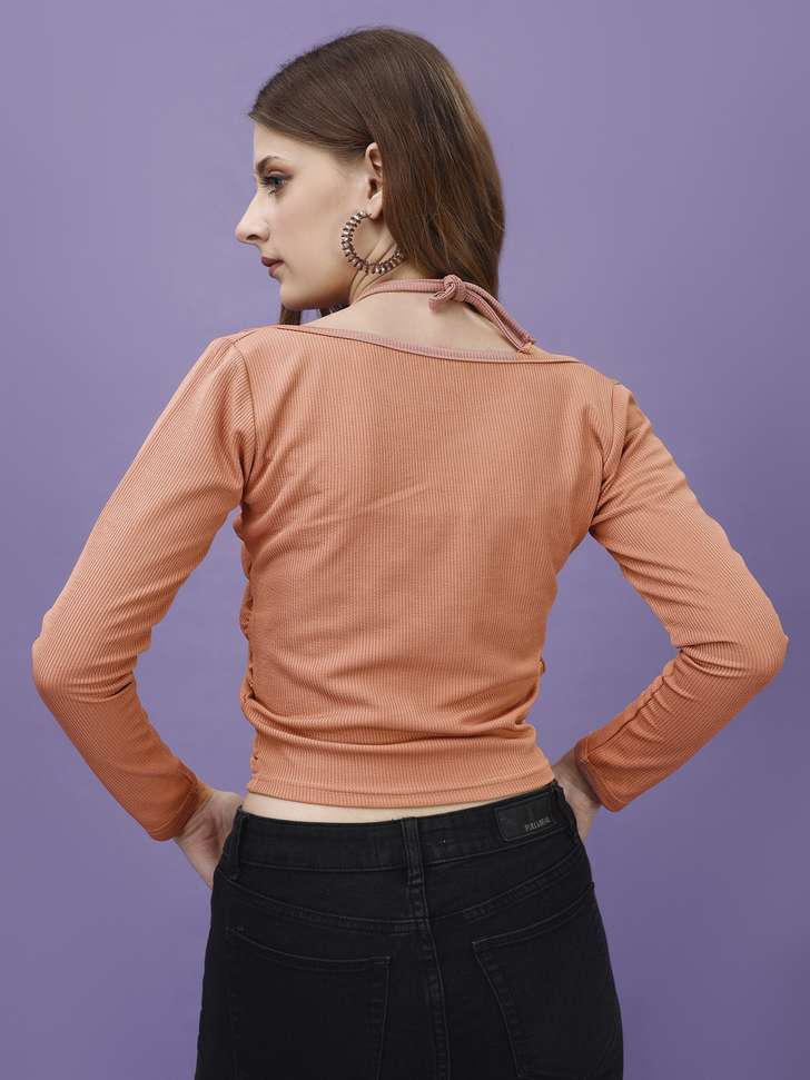 Soft on the skin and comfortable for long hours, this top is perfect for fashion-forward women who love minimal yet stylish clothing. The solid peach-orange shade adds a vibrant but elegant touch to your look.