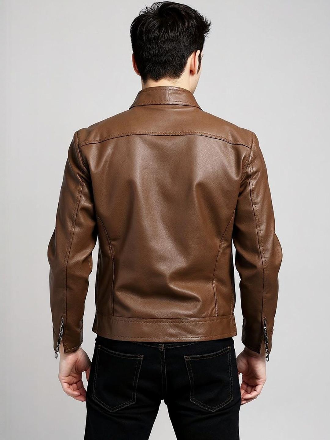 A stylish brown solid leather jacket featuring a mock collar, full zip closure, two pockets, and a clean straight hemline. Lightweight, durable, and perfect for everyday winter wear.