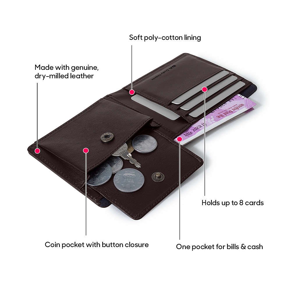 The interior features 4 card compartments, each capable of holding 2 cards—providing space for up to 8 credit/debit/ATM cards. With a dedicated coin pocket featuring a button closure, plus an additional cash & bill compartment, it keeps all essentials organized and easily accessible.