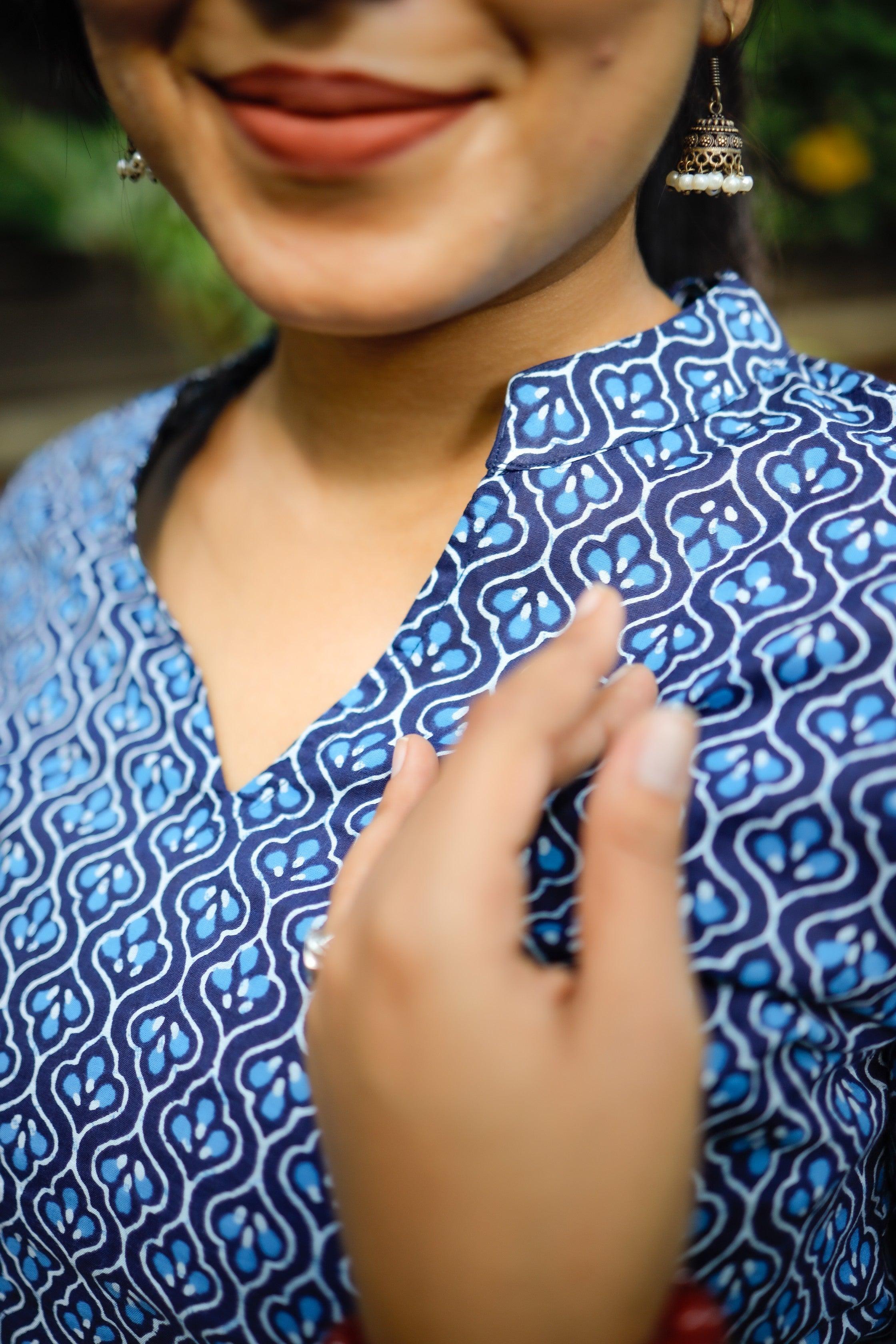A royal blue cotton slub kurti featuring resham embroidery, metallic thread highlights, mirror work, and elegant dori detailing for festive and ethnic occasions.