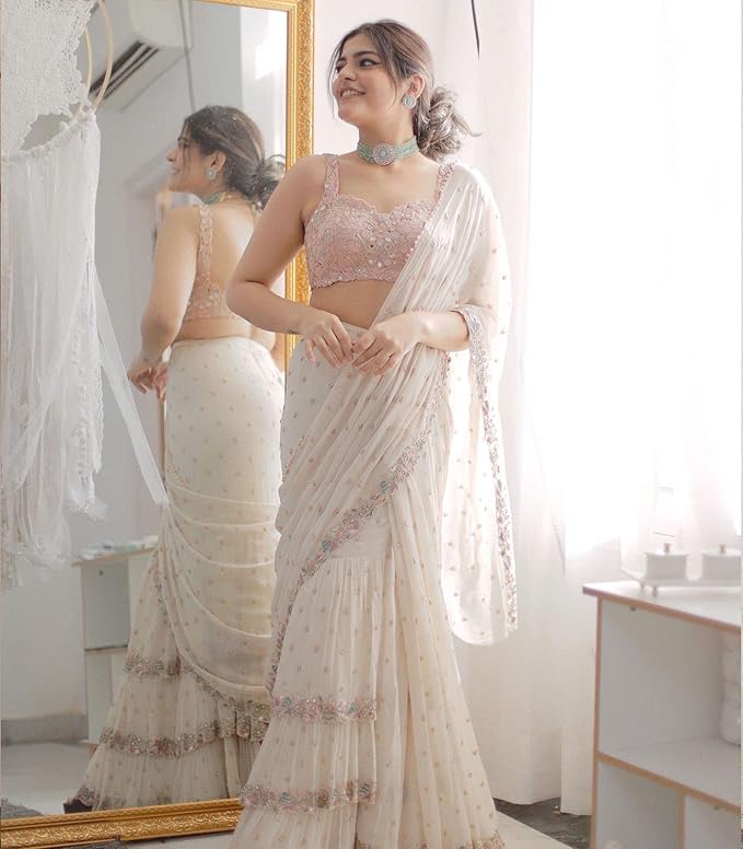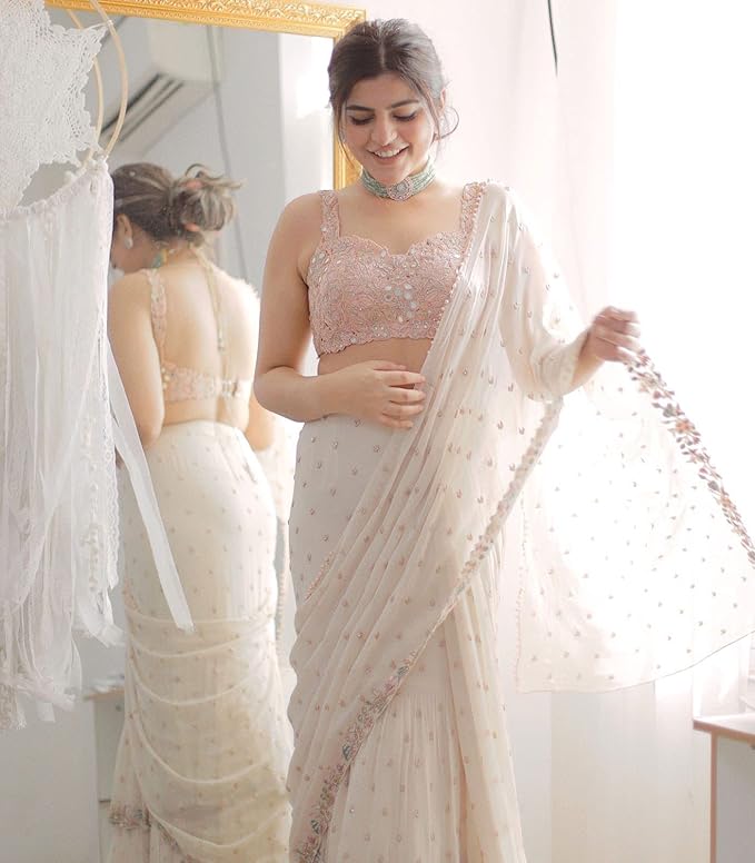 Elevate your traditional wardrobe with this exquisite White Faux Georgette Embroidered Saree, designed for women who adore sophisticated Bollywood-style fashion. Crafted from premium faux georgette, this saree showcases multi-thread sequins embroidery combined with real mirror work, giving it a radiant and luxurious finish.