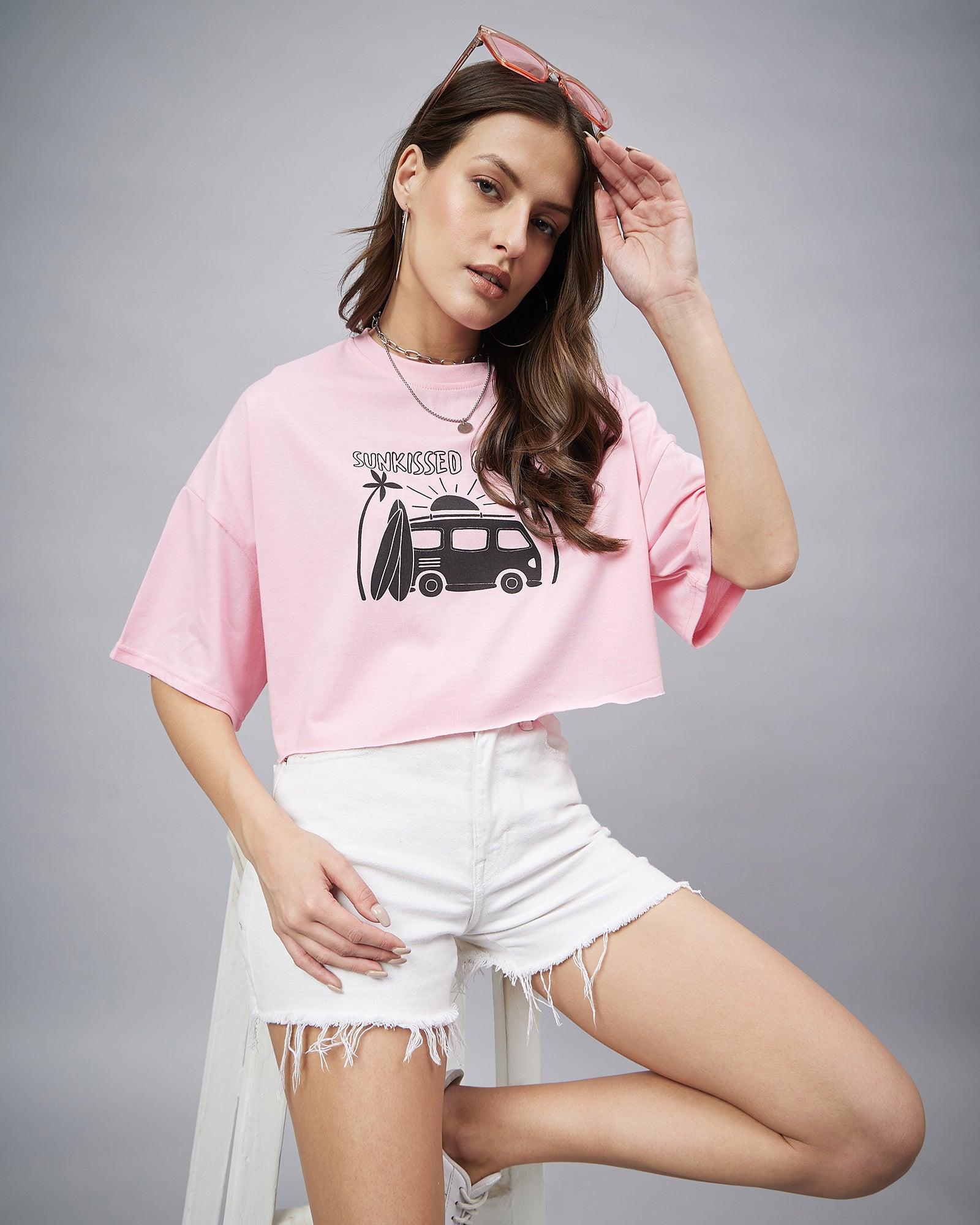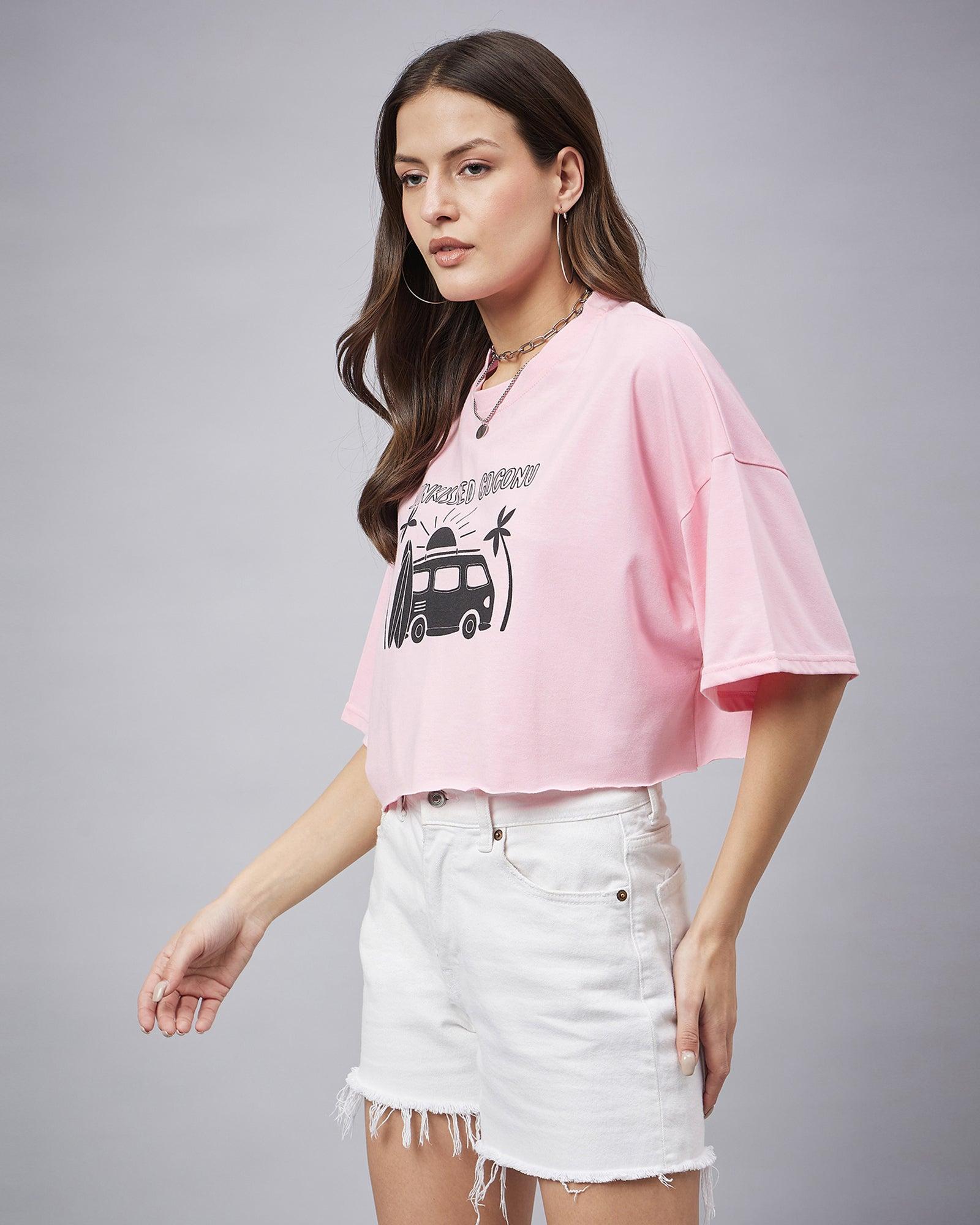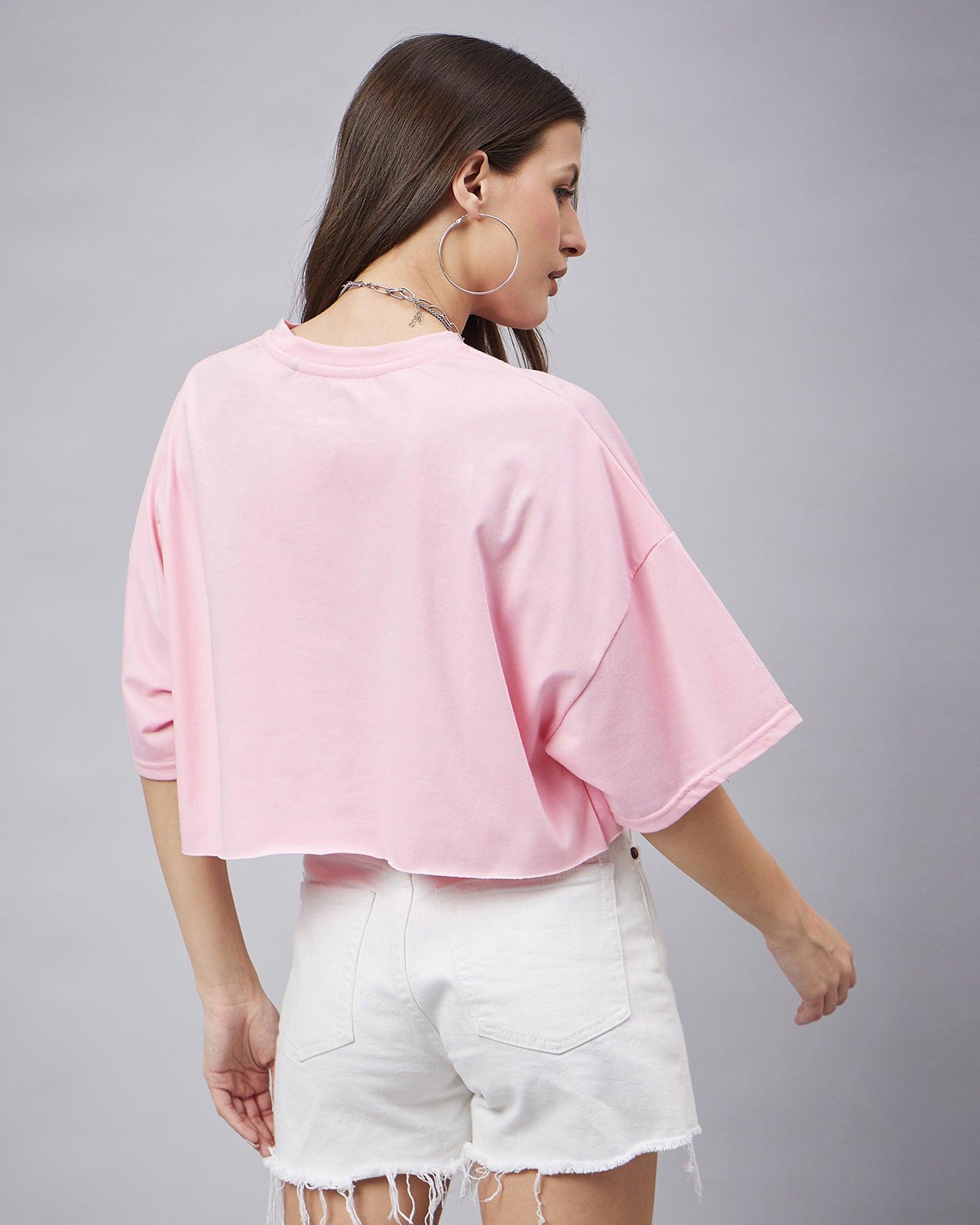 A soft cotton oversized crop t-shirt in light pink featuring a bold typographic design. Comfortable, trendy, and perfect for everyday casual or street-style looks.