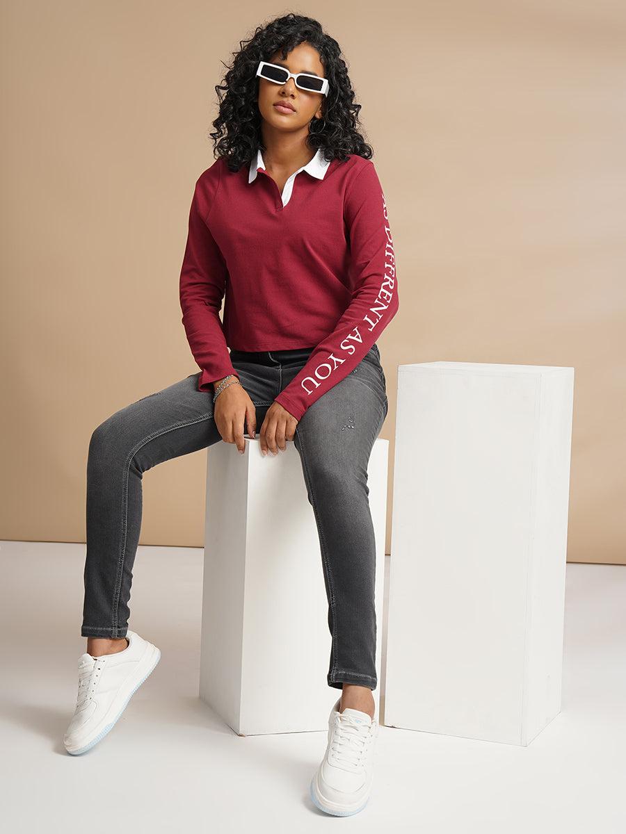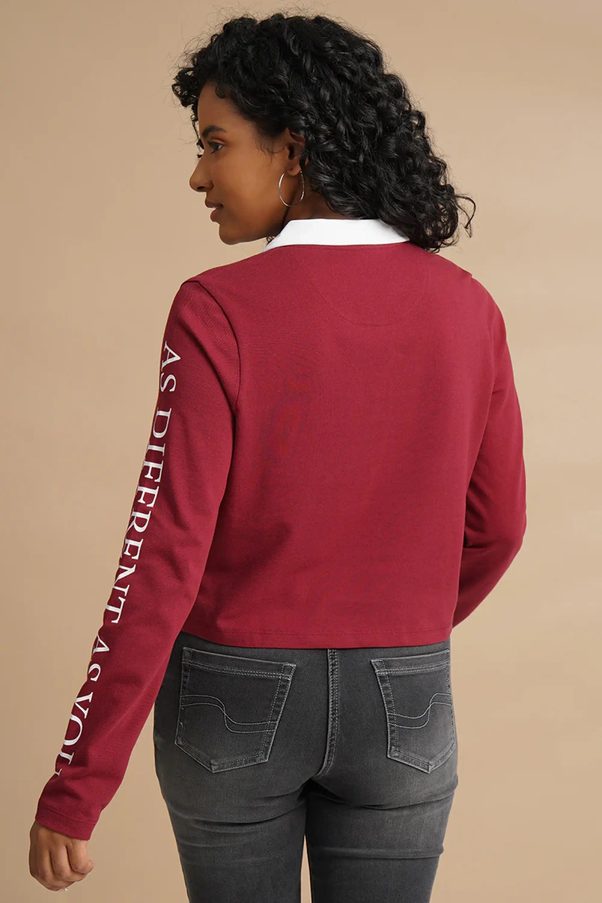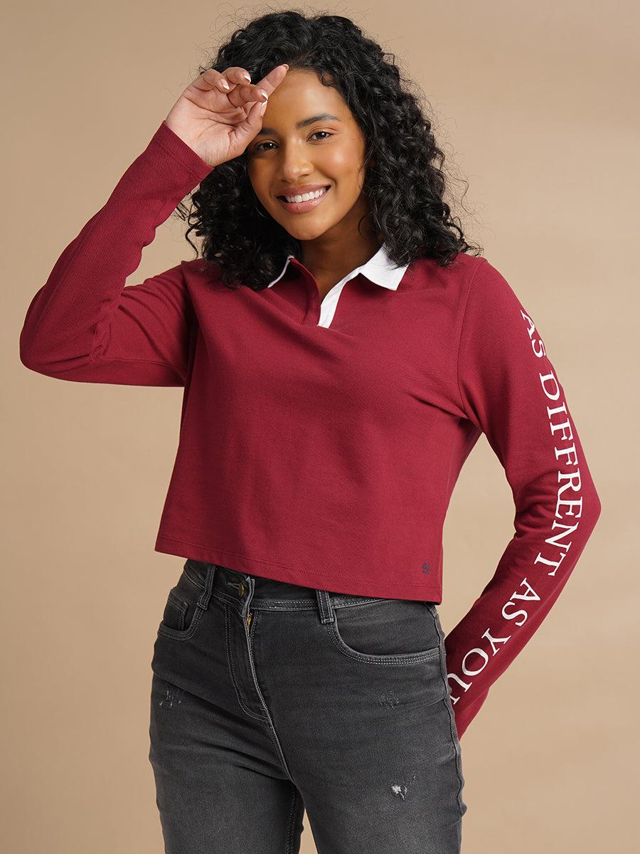 A stylish and comfortable women’s full sleeve red polo t-shirt crafted from soft cotton, featuring classic polo detailing and a chic printed design. Perfect for casual outings and everyday wear.
