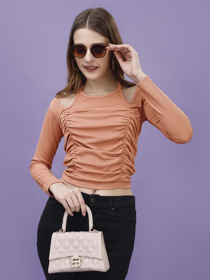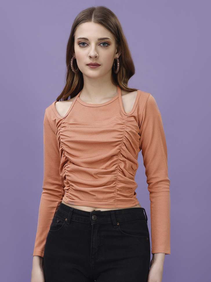 Soft on the skin and comfortable for long hours, this top is perfect for fashion-forward women who love minimal yet stylish clothing. The solid peach-orange shade adds a vibrant but elegant touch to your look.