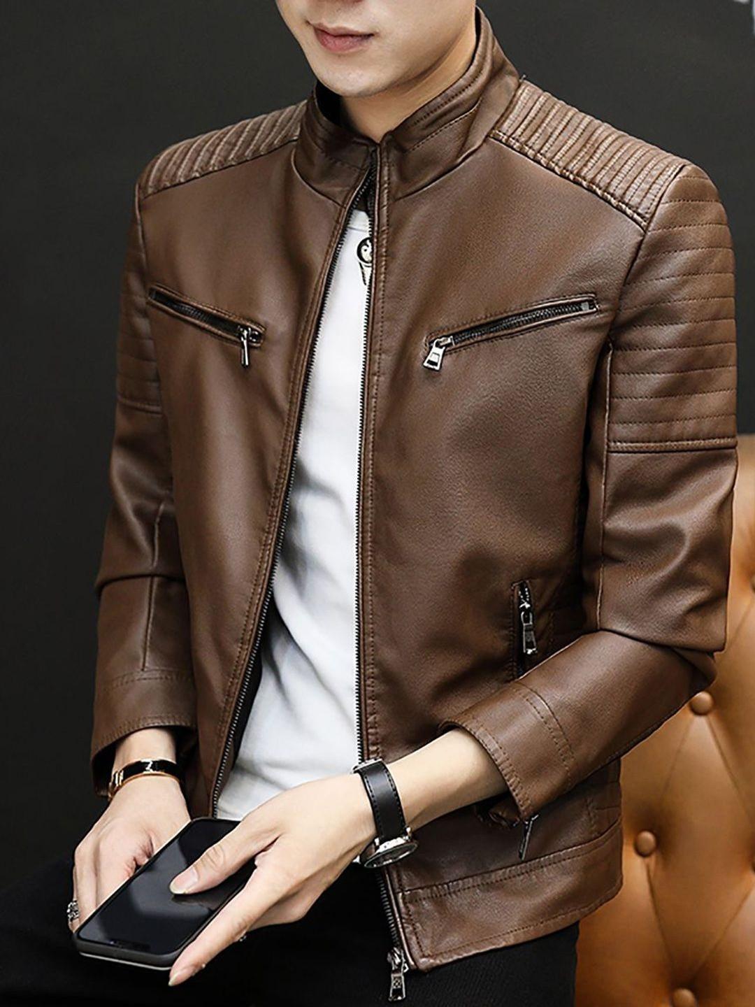 A stylish brown solid leather jacket featuring a mock collar, full zip closure, two pockets, and a clean straight hemline. Lightweight, durable, and perfect for everyday winter wear.