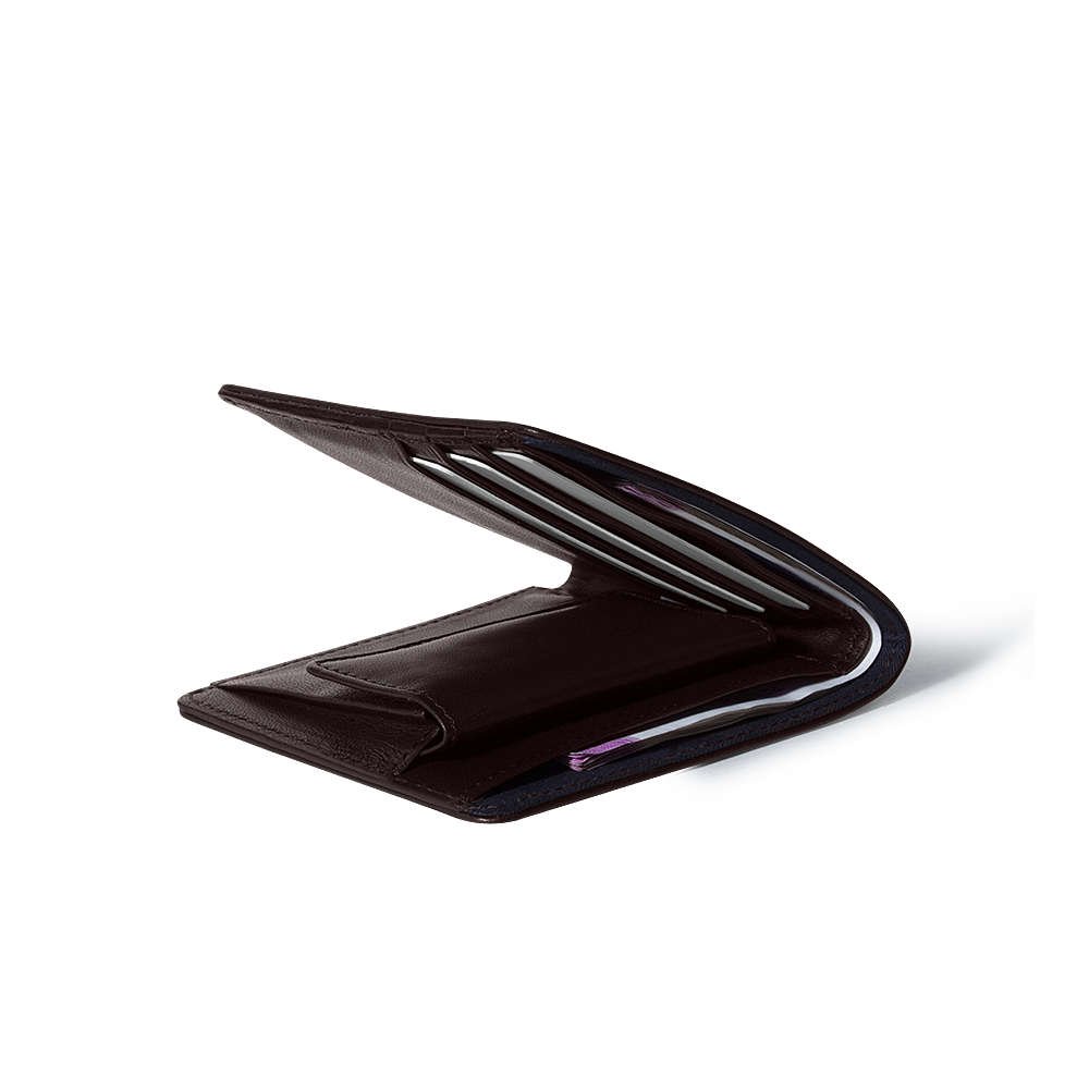 The interior features 4 card compartments, each capable of holding 2 cards—providing space for up to 8 credit/debit/ATM cards. With a dedicated coin pocket featuring a button closure, plus an additional cash & bill compartment, it keeps all essentials organized and easily accessible.