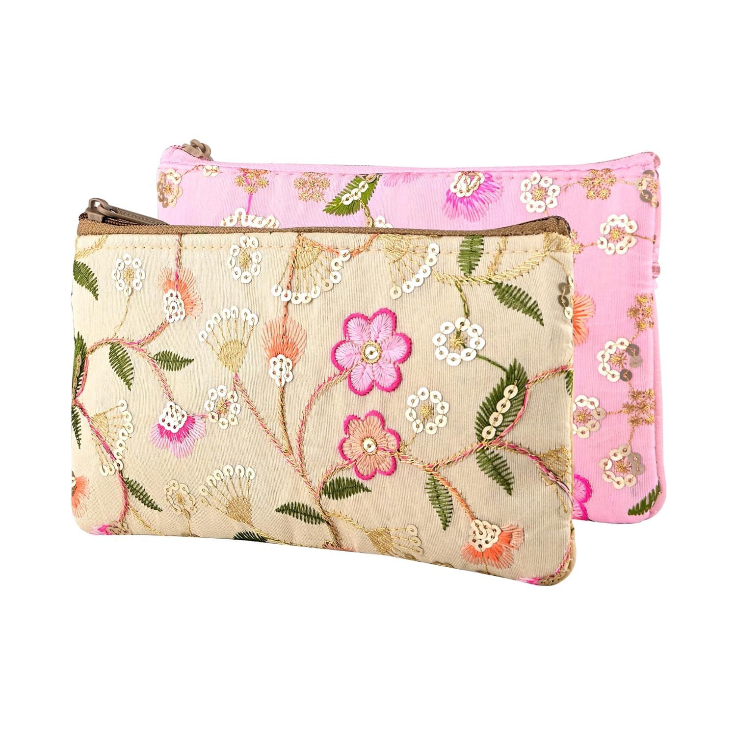 Traditional Embroidered Hand Purse Set for Women – 2 Pcs Floral Zip Pouch | Ethnic Ladies Wallet | Cream & Light Pink